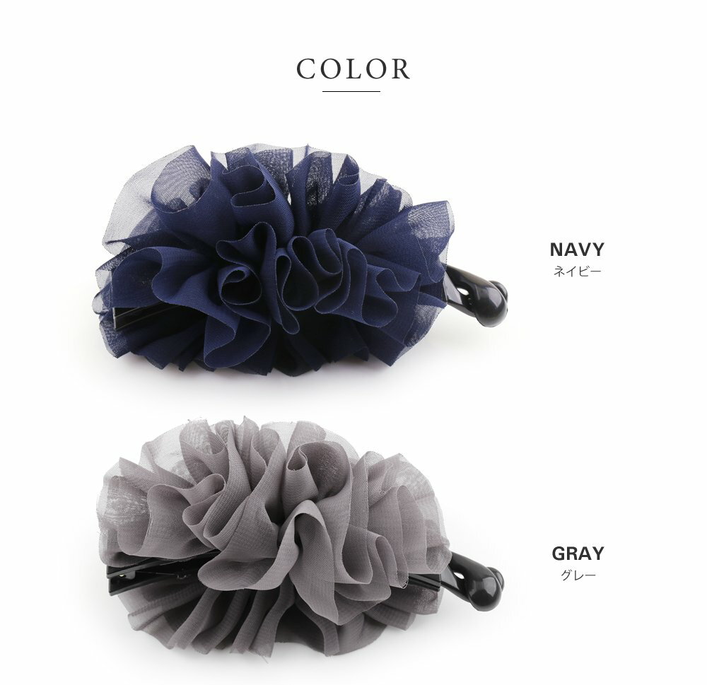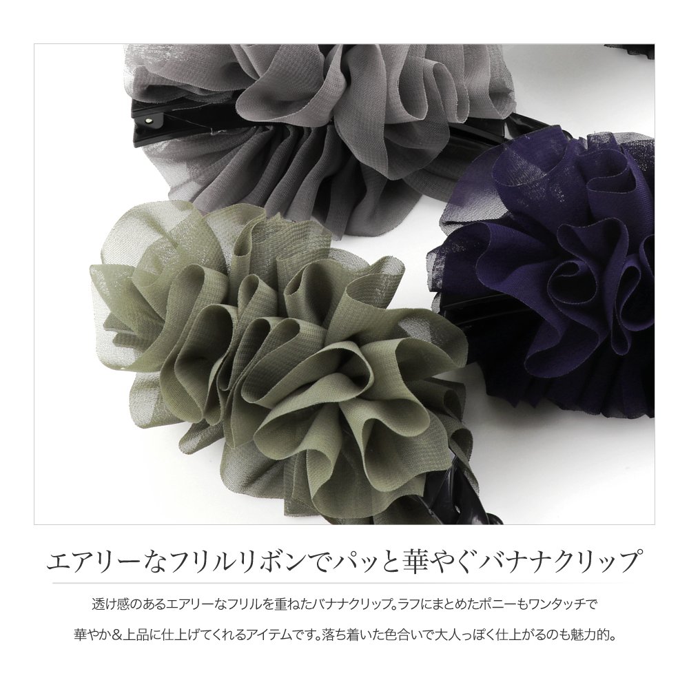 【全品送料無料!×P最大43倍!】バナナクリップ 大きめ しっかり リボン シフォン フリル ヘアクリップ シンプル ヘアアクセサリー 大人 上品 エレガント フェミニン 通勤 オフィス ブラック グレー カーキ ネイビー 母の日